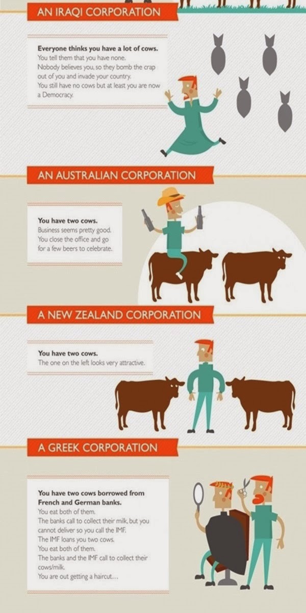 *Vizual.ly a publicat un infographic care ilustreaza o glumă clasica din anii 1940 - economia globala explicata prin povestea a doua vaci (in original “E Cow Nomics “). Povestea din gluma a fost actualizata la realitatea economiei actuale si au fost schimbate imaginile care ilustreaza conceptele din poveste